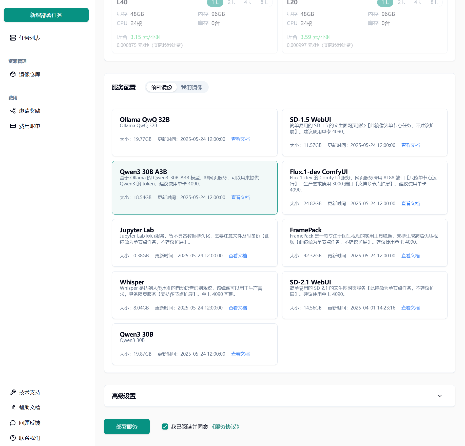 Section titled “1.3 选择相应预制镜像”这里选择 Qwen3 30B A3B,同意协议,点击部署服务。