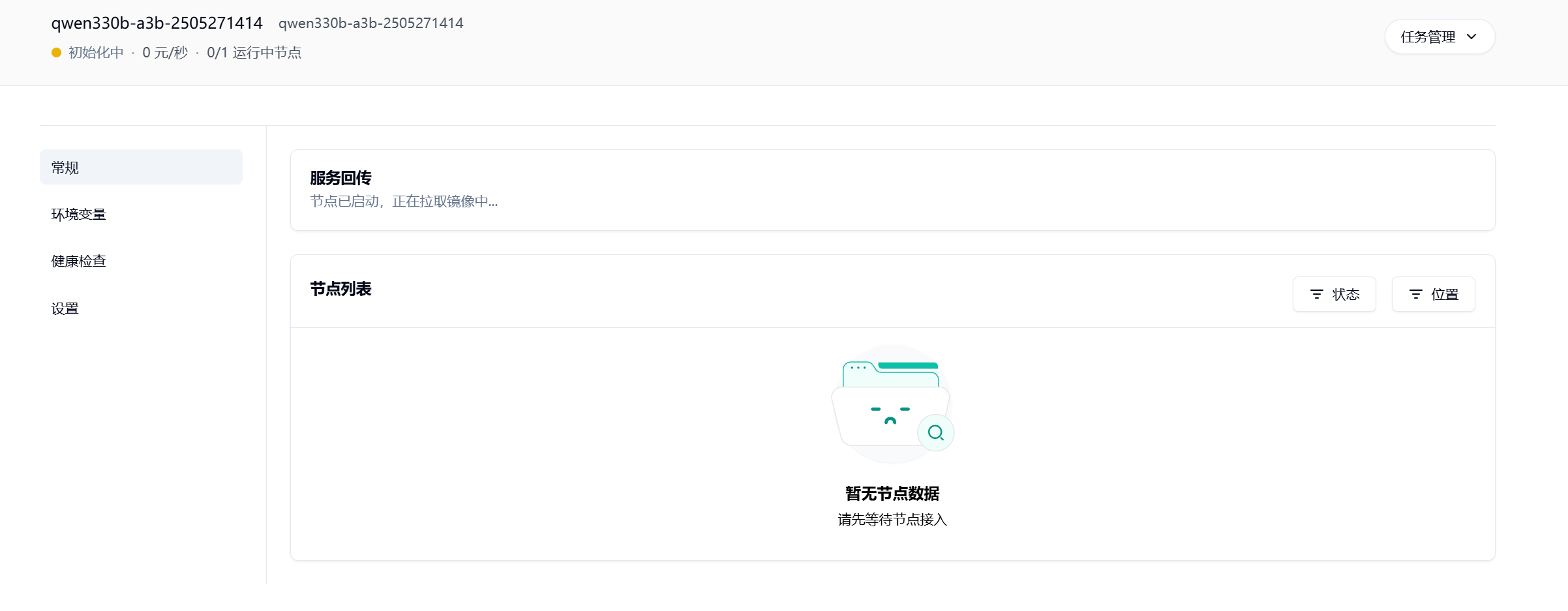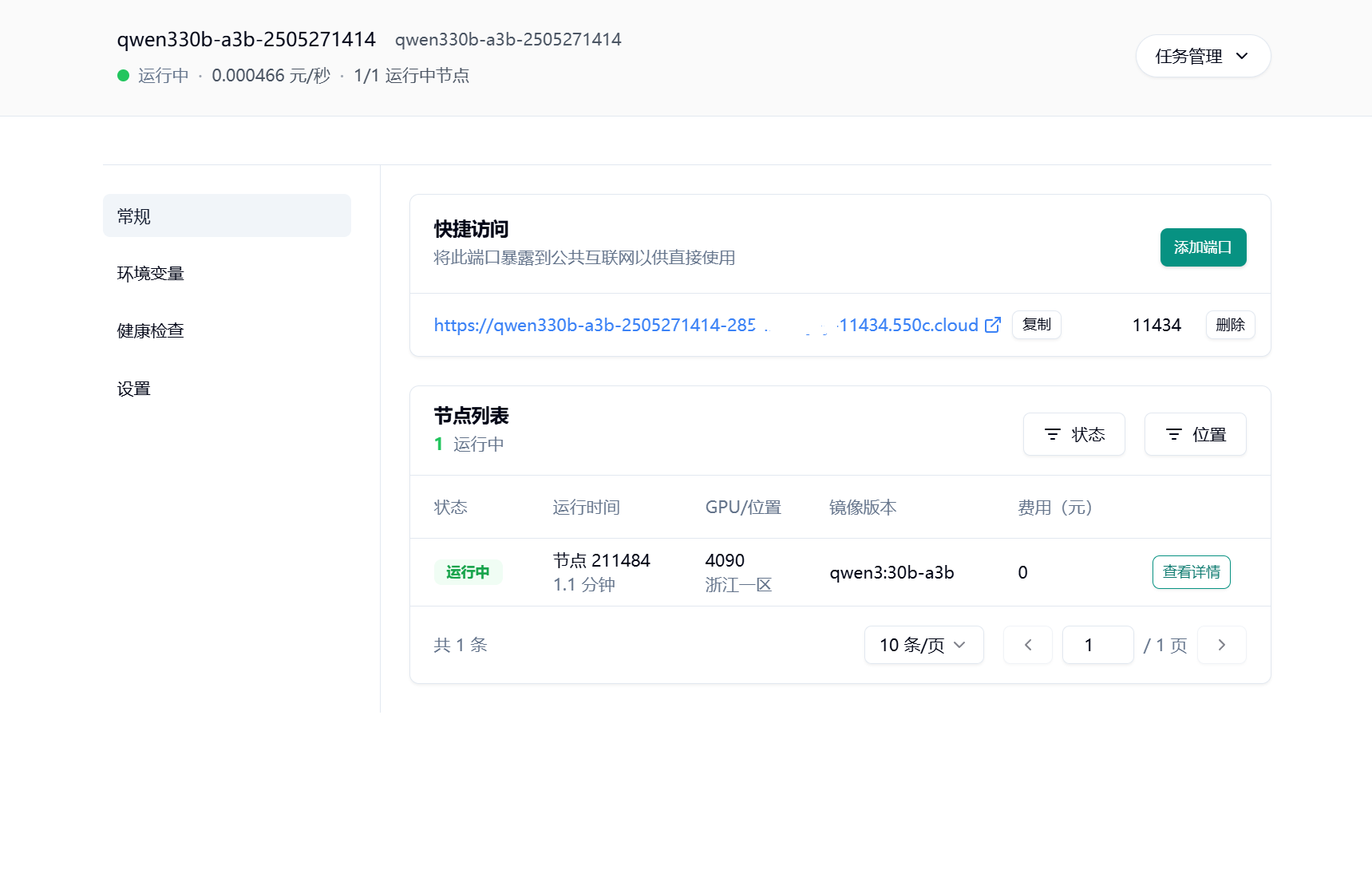 在“常规”面板里可以看到公开访问的地址,此地址即为 Ollama 服务的 API 地址。 请耐心一点~~ 模型镜像会比较大,qwen3:30b-a3b 镜像本身 20G+,打包之后大约 40G+, 拉取镜像会需要一段时间