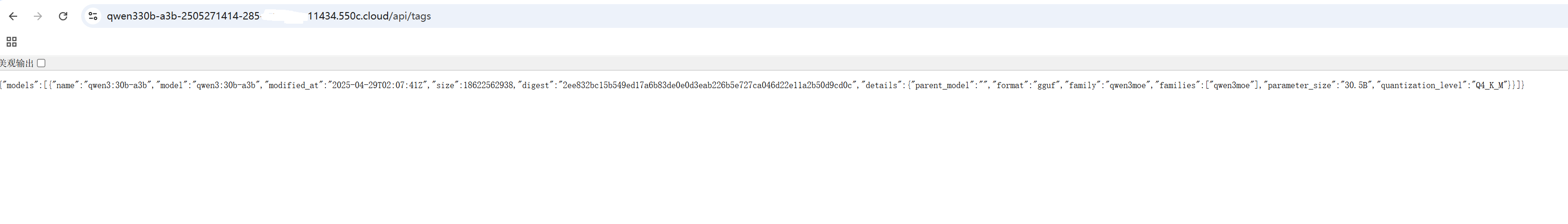 Section titled “1.6 验证一下”访问复制的链接,{快捷访问的地址} /api/tags,将链接复制到浏览器,就可以看到以下内容,说明模型已经部署并运行了。