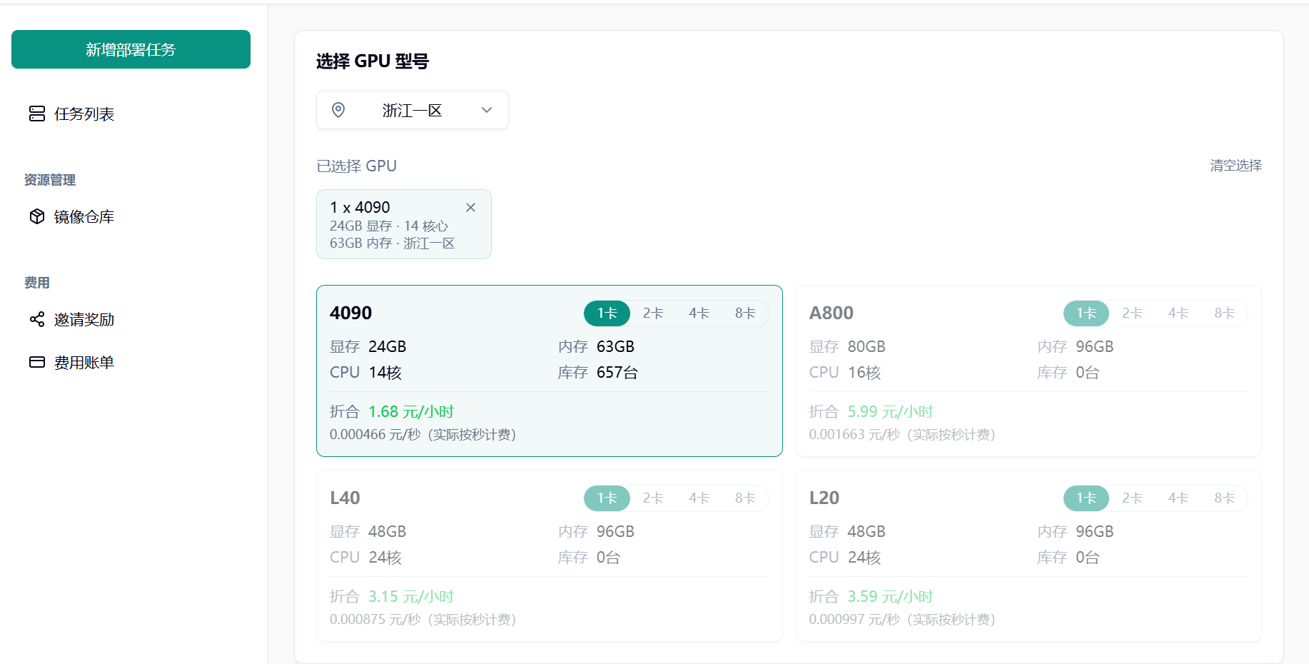 Section titled “1.2 选择设备”基于自身需要进行配置,参考配置为单卡 4090 和 1 个节点(初次使用进行调试)。