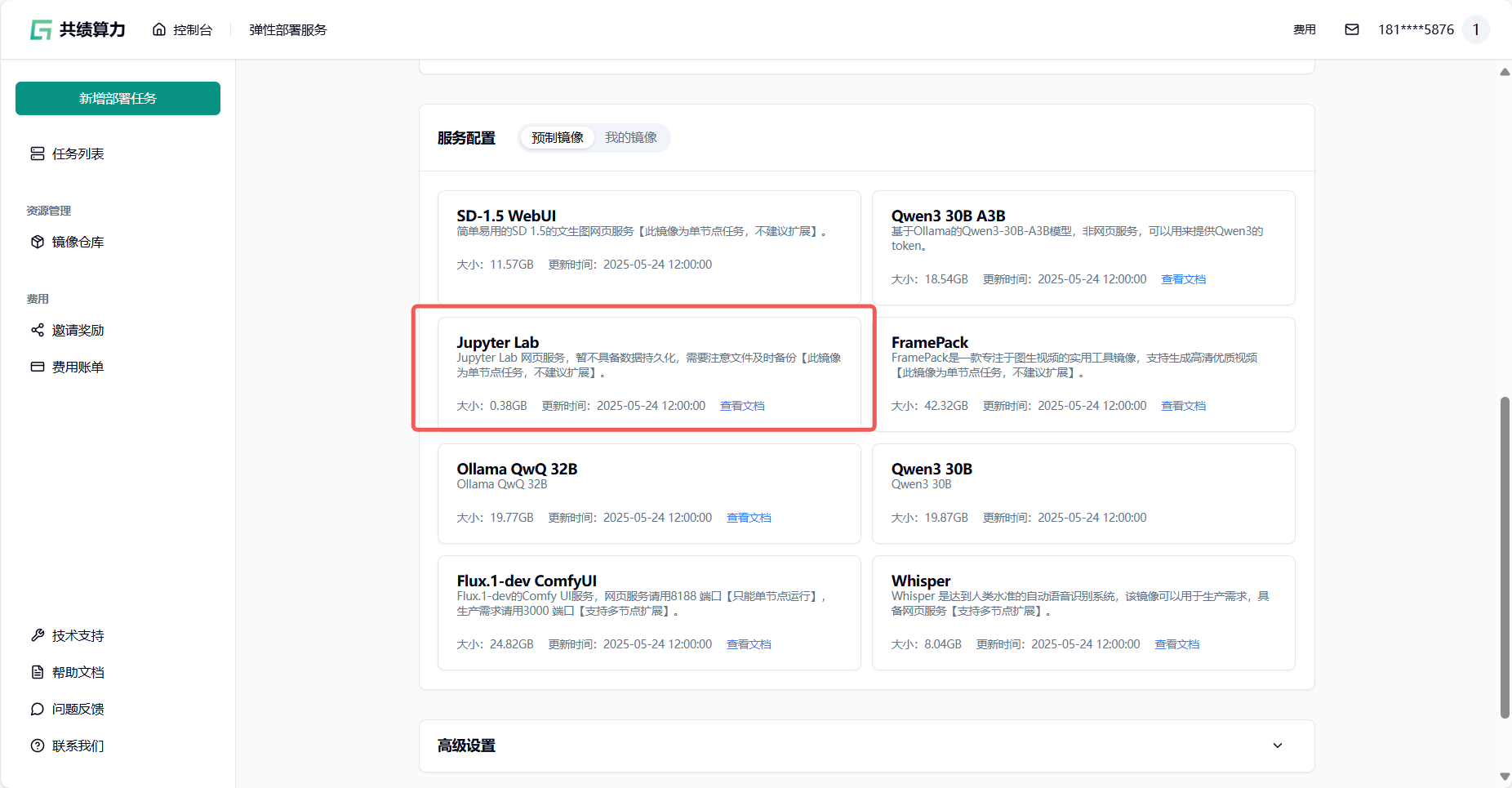 Section titled “1.在共绩算力上运行 JupyterLab”我们在服务配置——预制镜像中提供了预构建的 JupyterLab 容器映像,旨在满足一般要求。您可以选择直接在共绩算力上运行这些容器以执行任务。或者,您还可以通过使用我们资源管理里镜像仓库所提供的免费 Docker 镜像仓库服务,来方便管理您自身的 Docker 镜像。
