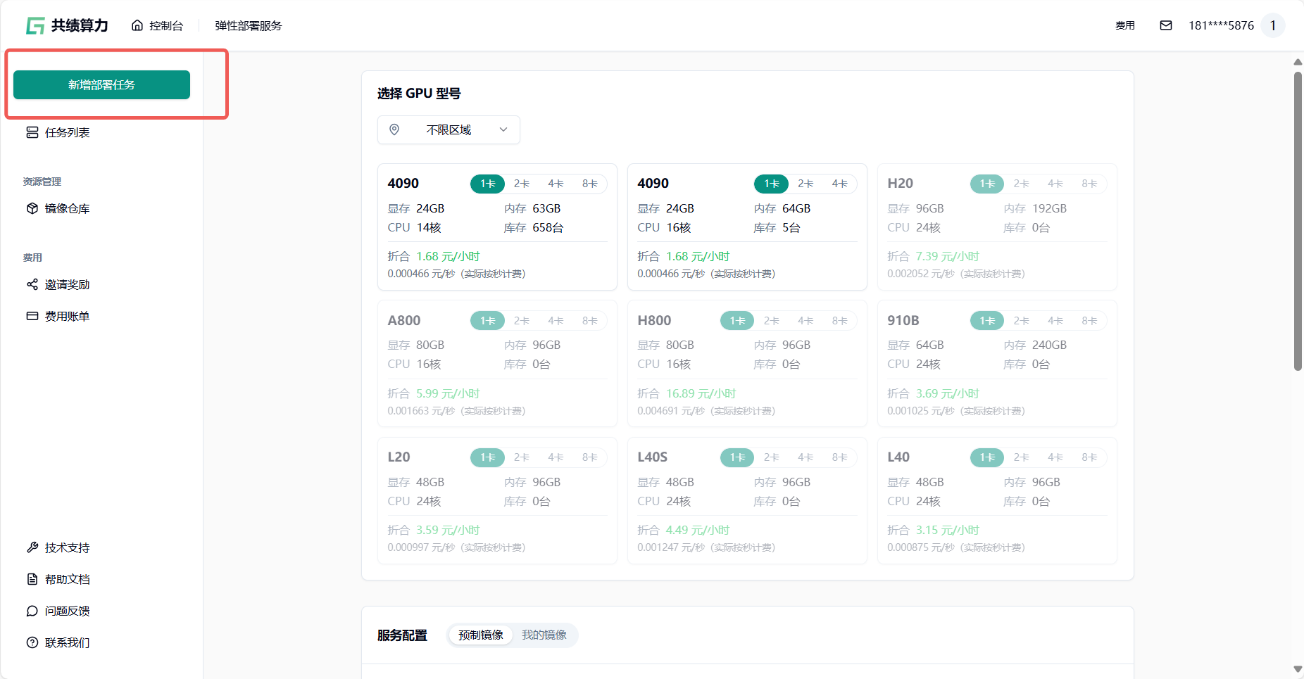 Section titled “1.1 选择 GPU 型号”选择 GPU 型号:推荐选择不限区域——享受全国闲置算力资源 随取随用