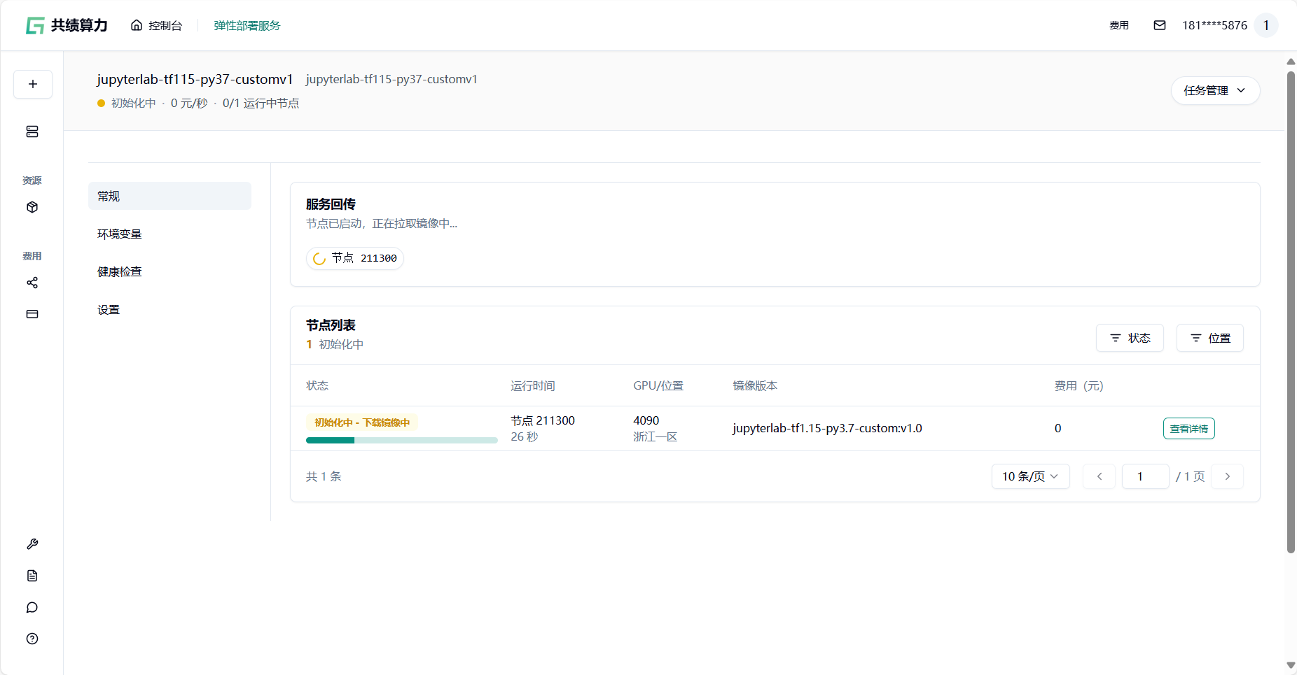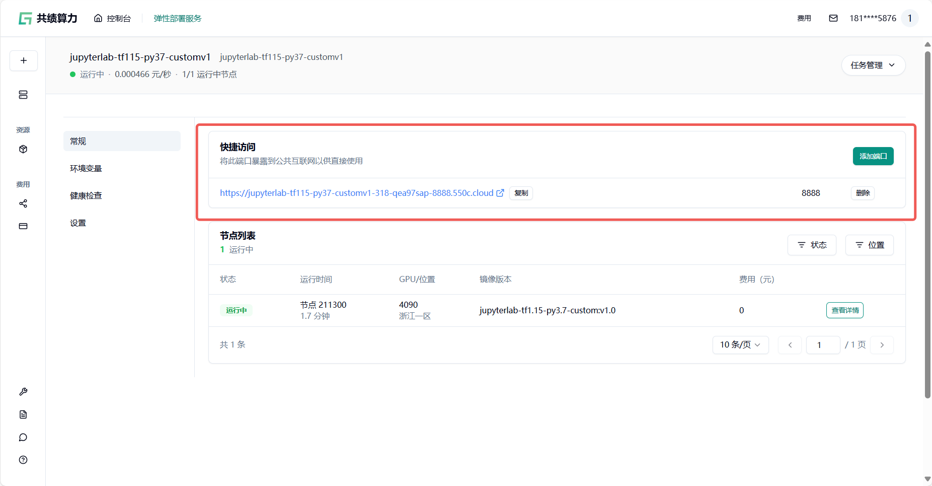 由于镜像体积较大,我们需要耐心等待一段时间,部署完成后页面显示如下图。节点分配完成后,可以通过点击回传链接访问服务: