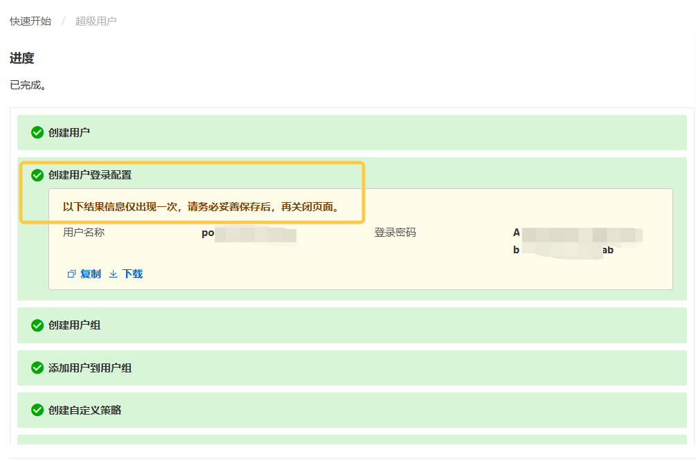 { "Version": "1", "Statement": [ { "Effect": "Allow", "Action": [ "oss:PutObject", "oss:GetObject", "oss:DeleteObject" ], "Resource": [ "acs:oss:*:*:your-oss-bucket-name/${ram:User}/*", "acs:oss:*:*:your-oss-bucket-name/${ram:User}" ] }, { "Effect": "Allow", "Action": "oss:ListObjects", "Resource": "acs:oss:*:*:your-oss-bucket-name", "Condition": { "StringLike": { "oss:Prefix": "${ram:User}/*" } } } ]}创建好密码后及时保存用户名称和密码相关信息(Access Key/Secret Key 对)