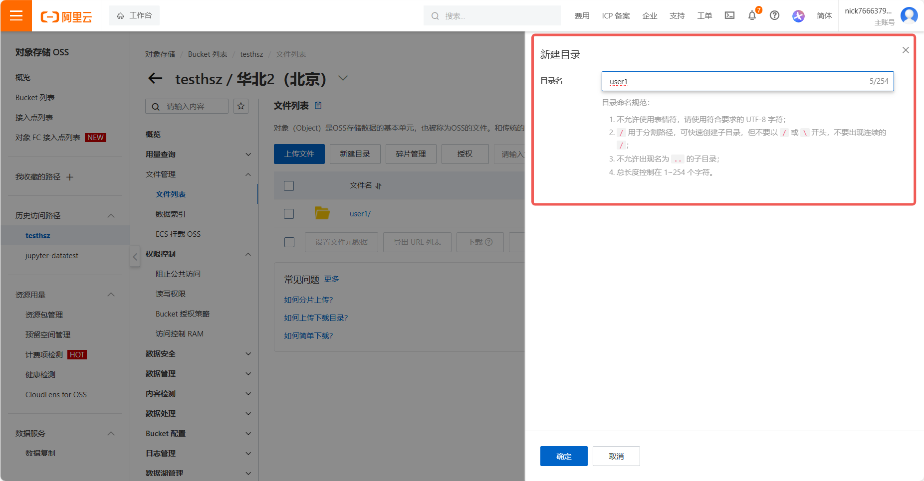 /user1。说明:OSS 为扁平化存储,目录通过前缀模拟,直接输入路径即可。