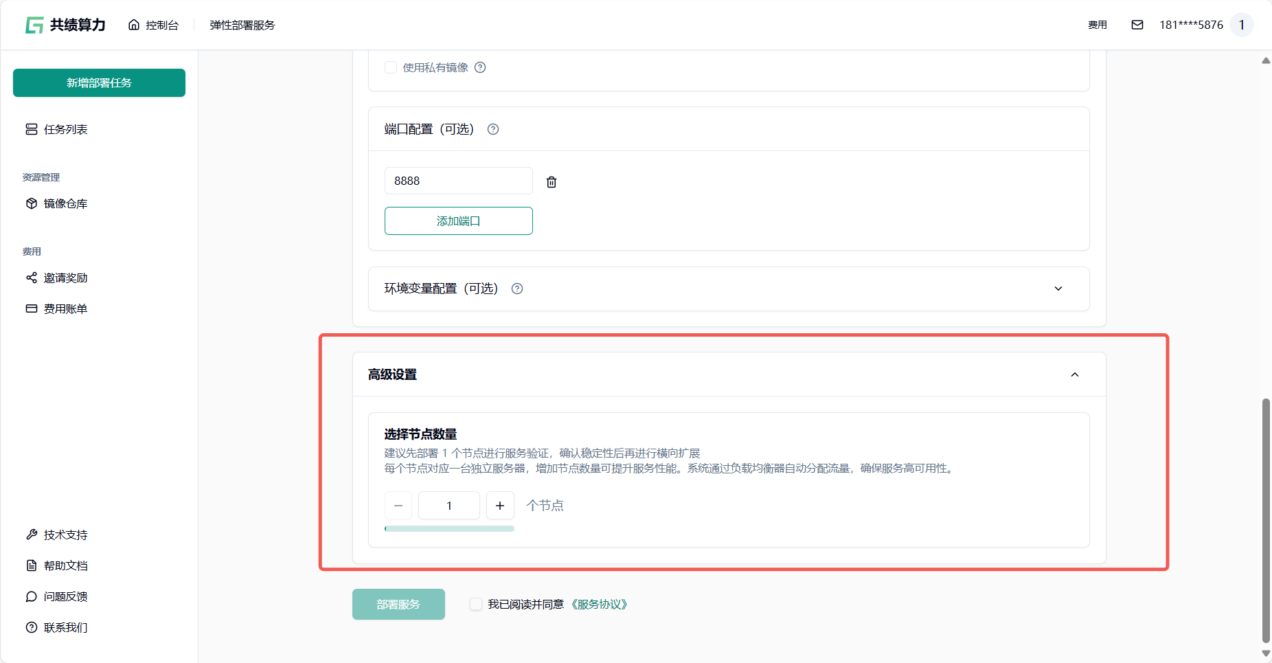 高级设置:建议先部署 1 个节点进行服务验证,确认稳定性后再进行横向扩展