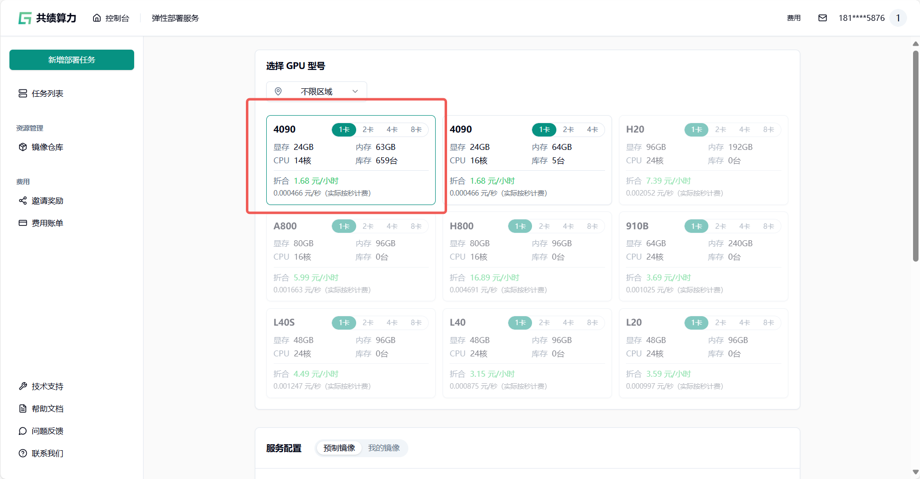 1.1 访问共绩算力控制台 https://console.suanli.cn,点击任意一个弹性部署服务。