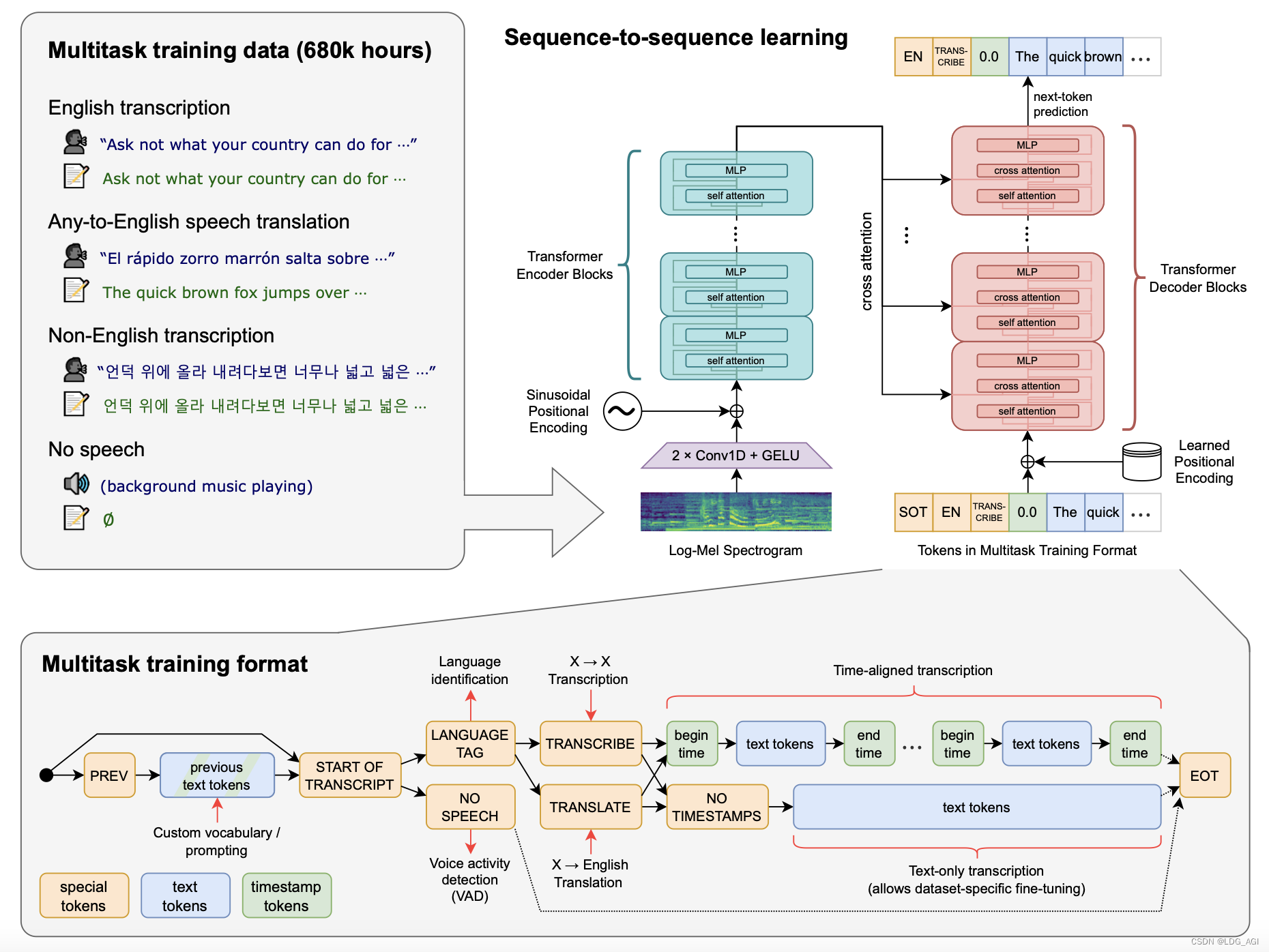 Whisper 是一个通用的语音识别模型,它使用了大量的多语言和多任务的监督数据来训练,能够在英语语音识别上达到接近人类水平的鲁棒性和准确性。Whisper 还可以进行多语言语音识别、语音翻译和语言识别等任务。Whisper 的架构是一个简单的端到端方法,采用了编码器 - 解码器的 Transformer 模型,将输入的音频转换为对应的文本序列,并根据特殊的标记来指定不同的任务。