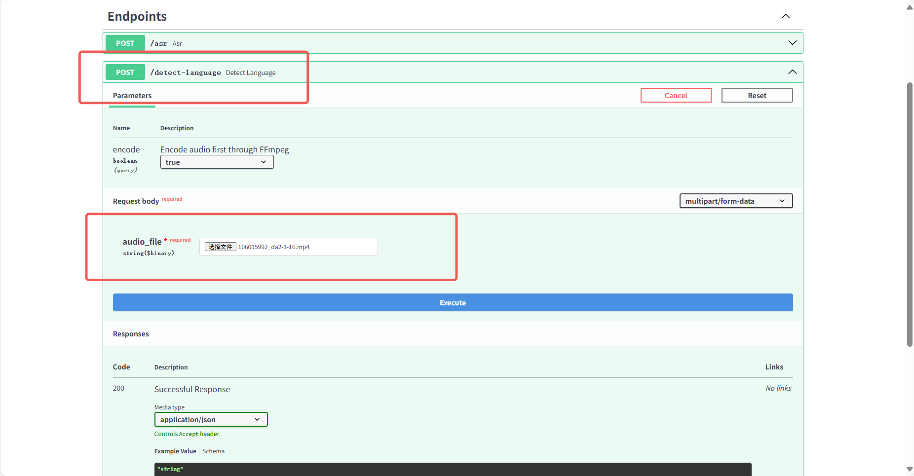 2./detect-language:语言检测接口,上传语音或者视频文件,输出语言。