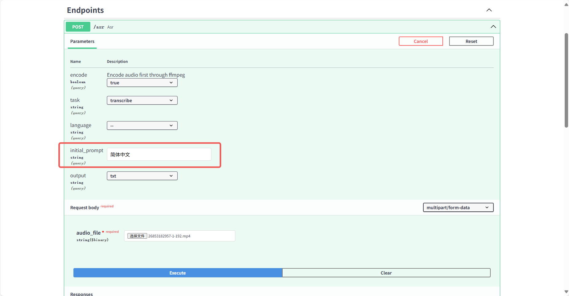 1./asr:语音识别接口,上传语音或者视频文件,输出文字。