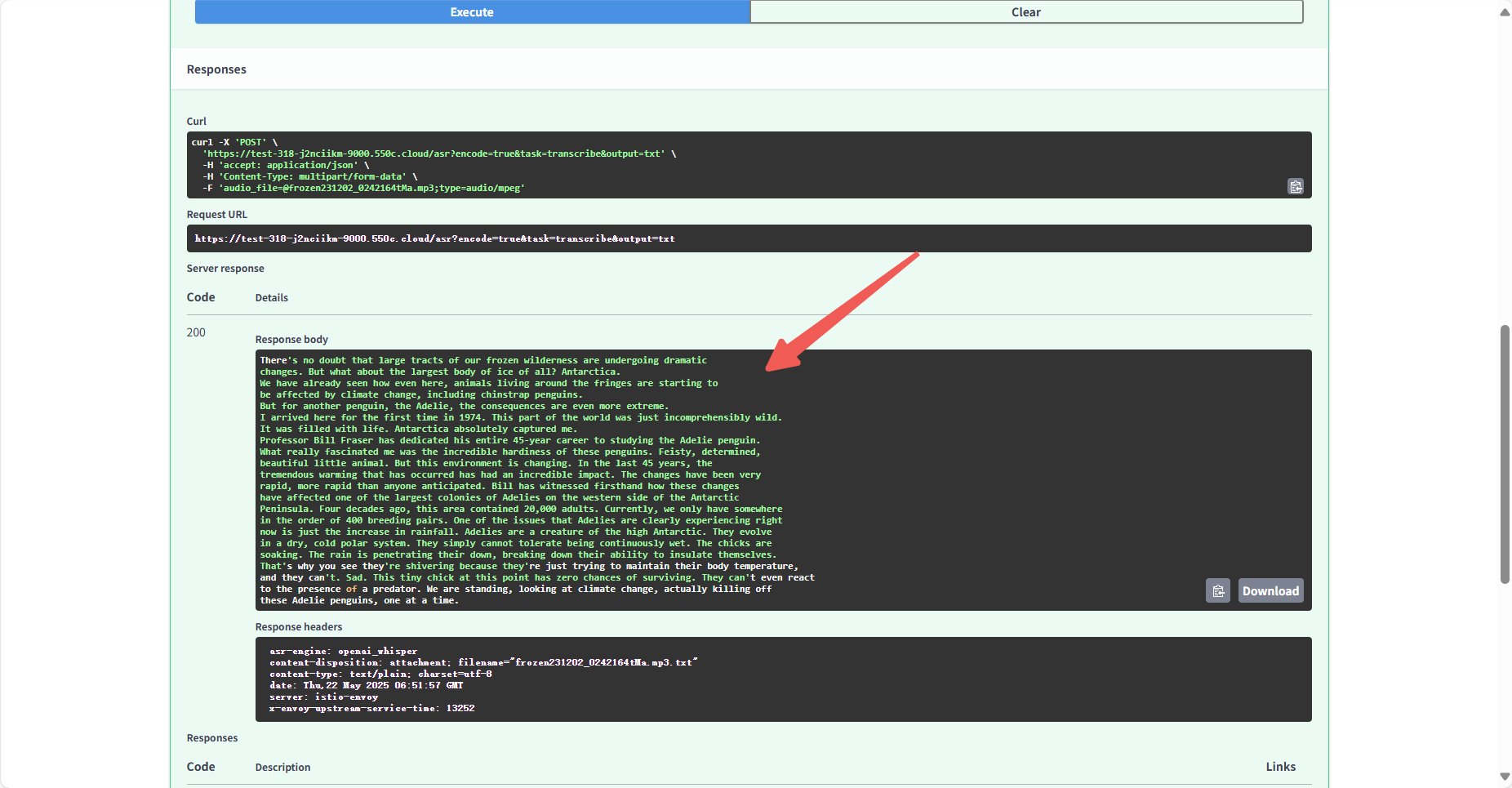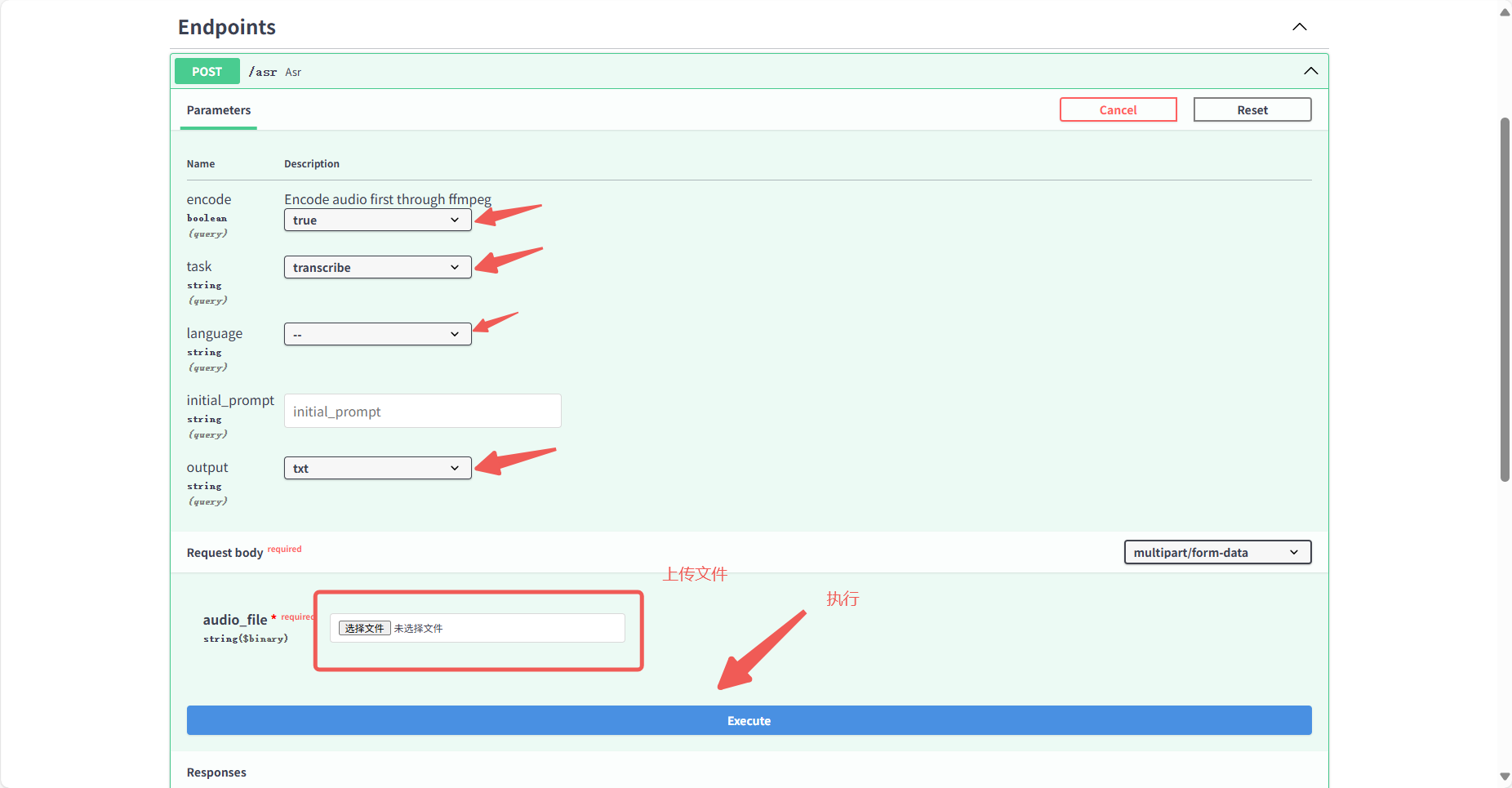 Section titled “2.2.1 英文音频转文字”点击/asr:语音识别接口后点击页面右上角Try it out 开始使用